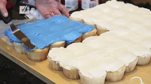 Step4On covered board or cutting board, arrange cooled cupcakes into rectangle. Mark off 12 cupcakes to be frosted blue. Pipe thick lines of white frosting onto remaining cupcakes; spread with spatula until smooth. Spoon blue frosting into separate decorating bag; pipe onto the 12 cupcakes and smooth. Carefully move blue section of cupcakes to join other portion of cupcakes.