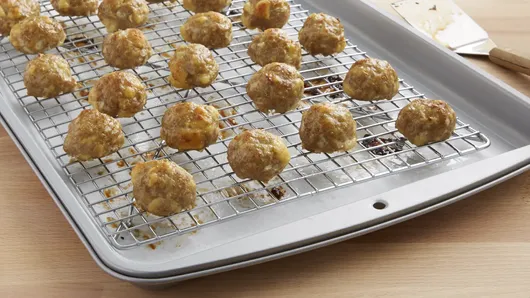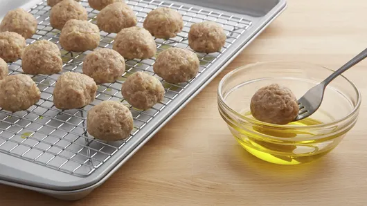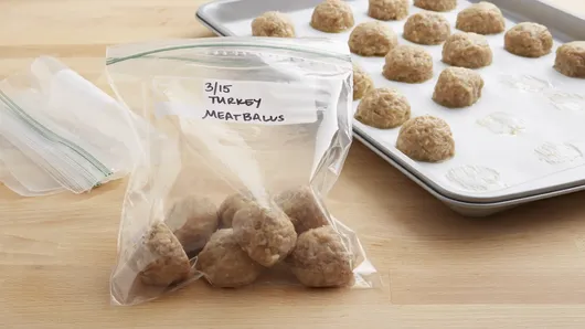 var configuration = {"title":"Freezer-Friendly Turkey Meatballs","introduction":"These tender, delicious turkey meatballs straight from your freezer make 30-minute meals easy and enticing.","servingSize":"1 Serving","image":{"small":{"media":"(min-width: 0px)","src":"https://mojo.generalmills.com/api/public/content/MCPt2fKKG0aHh1PydF2mCw_webp_base.webp?v=cd1e5e9b\u0026t=e724eca7b3c24a8aaa6e089ed9e611fd"},"medium":{"media":"(min-width: 500px)","src":"https://mojo.generalmills.com/api/public/content/MCPt2fKKG0aHh1PydF2mCw_webp_base.webp?v=cd1e5e9b\u0026t=191ddcab8d1c415fa10fa00a14351227"},"large":{"media":"(min-width: 767px)","src":"https://mojo.generalmills.com/api/public/content/MCPt2fKKG0aHh1PydF2mCw_webp_base.webp?v=cd1e5e9b\u0026t=191ddcab8d1c415fa10fa00a14351227"},"alt":"Freezer-Friendly Turkey Meatballs"},"contributor":{"label":"By","name":"Betty Crocker Kitchens","profileUrl":"/about-us","displayDate":{"label":"Updated","date":"Jan 6, 2015"}},"ingredientGroups":[{"ingredients":[{"quantity":"3","description":"eggs, beaten"},{"quantity":"1 1/2","description":"cups milk"},{"quantity":"8","description":"slices white bread, crusts removed, cubed (about 5 cups)"},{"quantity":"40","description":"oz ground turkey"},{"quantity":"2","description":"teaspoons salt"},{"quantity":"1","description":"large onion, finely chopped (about 2 cups)"},{"quantity":"6","description":"cloves garlic, finely chopped"},{"quantity":"1","description":"tablespoon Dijon mustard"},{"quantity":"1","description":"teaspoon Worcestershire sauce "},{"quantity":"1/2","description":"cup olive oil"},{"quantity":"3","description":"cans (15 oz each) Muir Glen™ organic pizza sauce, if desired"}]}],"steps":[{"description":"In large bowl, mix eggs and milk. Add bread; cover and refrigerate 20 minutes. Drain off and save 3/4 cup of the egg mixture, and discard remaining egg mixture. Stir bread and the 3/4 cup egg mixture with spoon until smooth. Add remaining ingredients except oil and pizza sauce, and stir gently until combined.","stepShotImageUrl":"//mojo.generalmills.com/api/public/content/DzFgF2yQPUeG9vtKJNz51w_webp_base.webp?v=e859532d\u0026t=51a43a57af4046789e5a7f20567b1195"},{"description":"Heat oven to 400°F. Line 2 rimmed cookie sheets with cooking parchment paper. Top each pan with a rack. Spray with cooking spray.","stepShotImageUrl":"//mojo.generalmills.com/api/public/content/XZH-rzJzpU6jeemkQ-Vi-w_webp_base.webp?v=ecd463c5\u0026t=51a43a57af4046789e5a7f20567b1195"},{"description":"Using wet hands, shape meatballs into 64 (1 1/2-inch) balls. Dip or brush bottoms of meatballs with oil, and place 1 inch apart on racks."},{"description":"Bake 45 to 50 minutes or until instant-read thermometer inserted in center of meatballs reads 165°F. Serve with warmed pizza sauce.","stepShotImageUrl":"//mojo.generalmills.com/api/public/content/tXV1u0Rj6kWwB-u8Sxp7lg_webp_base.webp?v=d75c2a70\u0026t=51a43a57af4046789e5a7f20567b1195"},{"description":"To freeze, skip Step 2. After Step 3, place raw meatballs on parchment-lined cookie sheet; cover with plastic wrap, and freeze until firm, at least 2 hours. Label 8 quart-sized freezer plastic bags, including date, then add 8 meatballs to each. Press air out of bag, seal and freeze up to 3 months.","stepShotImageUrl":"//mojo.generalmills.com/api/public/content/YU-sfk4thUS3ZPe96egaFg_webp_base.webp?v=3dcdd47c\u0026t=51a43a57af4046789e5a7f20567b1195"}],"tips":[{"title":"","description":"To prepare meatballs on the stove-top, heat 1 tablespoon oil in 12-inch nonstick skillet over medium-high heat. Add 8 raw meatballs to skillet, and cook 5 minutes, turning frequently and gently. Reduce heat to medium; add 1 cup pasta sauce, and simmer 5 to 8 minutes or until meatballs reach internal temperature of 165°F.","category":"Variation","tipShots":[]},{"title":"","description":"This recipe uses a \u0022panade\u0022 of bread, milk and eggs to keep the turkey moist and tender during cooking. This makes the mixture a little looser to work with than a traditional meatball mix, but results in an excellent flavor and texture when cooked.\r\n","category":"Recipe/Ingredient Facts","tipShots":[]},{"title":"","description":"Recipe meets Kitchen Tested criteria. Reviewed as part of SEO improvements Oct. 2019.","category":"Kitchen Tested","tipShots":[]}],"kitchenTips":[{"title":"","description":"To prepare meatballs on the stove-top, heat 1 tablespoon oil in 12-inch nonstick skillet over medium-high heat. Add 8 raw meatballs to skillet, and cook 5 minutes, turning frequently and gently. Reduce heat to medium; add 1 cup pasta sauce, and simmer 5 to 8 minutes or until meatballs reach internal temperature of 165°F.","category":"Variation","tipShots":[]},{"title":"","description":"This recipe uses a \u0022panade\u0022 of bread, milk and eggs to keep the turkey moist and tender during cooking. This makes the mixture a little looser to work with than a traditional meatball mix, but results in an excellent flavor and texture when cooked.\r\n","category":"Recipe/Ingredient Facts","tipShots":[]}],"additionalContent":[],"faq":[],"tipCategories":[{"categoryName":"Kitchen Tested","heading":"More About This Recipe","cssClass":"recipePartStory","expandOnInit":false,"expandText":"More +","collapseText":"Less -","expandEventName":"","collapseEventName":"","image":"","tips":[{"title":"","description":"Recipe meets Kitchen Tested criteria. Reviewed as part of SEO improvements Oct. 2019.","category":"Kitchen Tested","tipShots":[]}],"isExpandable":false}],"nutritionInfo":{"configuration":{"showAsTable":false,"noNutritionInformationAvailableMessage":"Nutrition Facts are not available for this recipe","poweredByText":"\u003cp\u003eNutrition information for this recipe is estimated using a leading nutrition calculation application, but is an estimate only. Actual nutrition values will vary based on the exact ingredients or brands you may use.\u003c/p\u003e\n\u003ca href=\u0022http://developer.edamam.com\u0022\u003ePowered By \u003