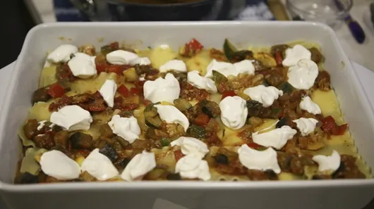 Step3Into 13x9-inch (3-quart) glass baking dish, spoon one-fourth of the vegetable mixture. Add layer of lasagna noodles; top with another one-fourth of vegetable mixture. Add sliced mozzarella, another layer of noodles and half of remaining vegetable mixture. Dollop crème fraîche over top. Add another layer of noodles and remaining vegetable mixture. Top with shredded mozzarella cheese and the Parmesan cheese. Cover dish with foil.