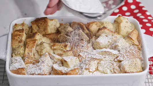 Allow the baked French toast to cool for 15 minutes on a cooling rack before serving.