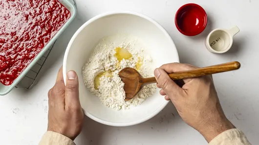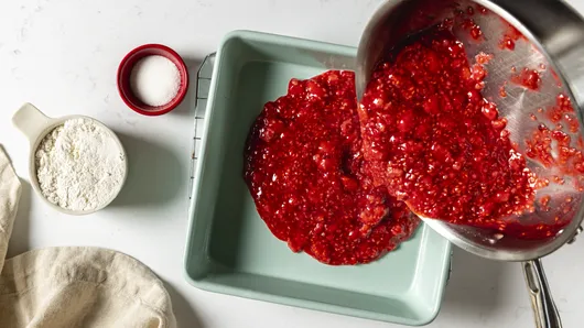 Pour berry mixture into 8-inch (2-quart) glass baking dish or baking pan.