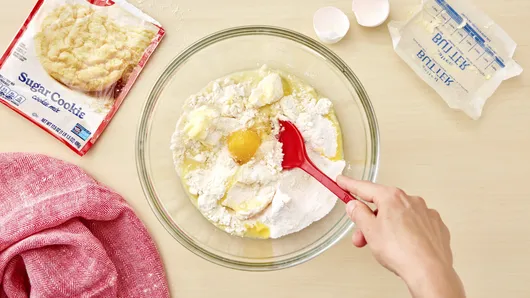 Combine Betty Crocker™ sugar cookie mix, dry vanilla instant pudding and pie filling, softened butter, water, and an egg and mix in a large bowl.