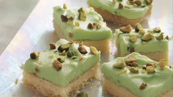 Step4To serve, let dessert thaw in refrigerator for about 1 hour. Carefully run knife around sides of pan. Top each serving with reserved whipped topping, raspberry sauce and about 1/2 teaspoon chopped pistachios.