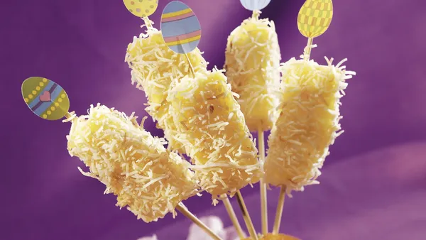 Step2Carefully insert wooden stick into cut end of each banana half. Roll each banana in yogurt, then sprinkle with cereal. Place on cookie sheet.