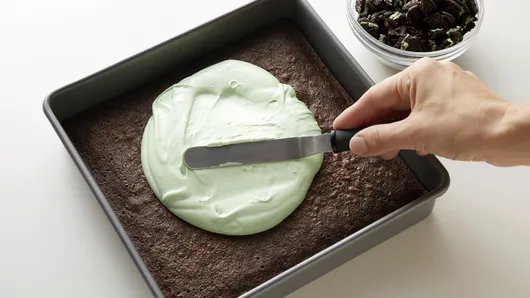 Step3In medium bowl, stir together frosting, marshmallow creme, mint extract and food color until well blended. Spread over cooled brownies. Sprinkle with cookies; press in slightly. Cut into 4 rows by 4 rows.