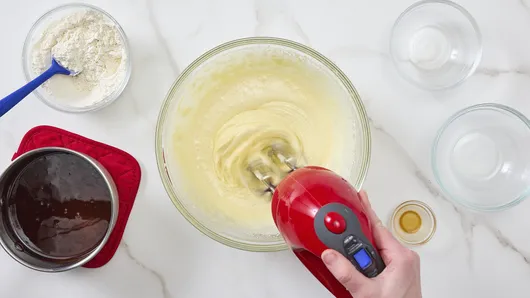 Beat the sugar, vanilla, and eggs in a medium bowl on high speed for 5 minutes until the mixture is light in color and slightly fluffy. This step adds air to the batter, giving your fudgy brownies lift and the right texture.