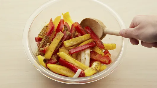 Step2In medium bowl, mix bell peppers, onions, oil, cumin, coriander and salt; set aside.