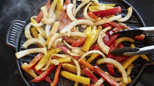 Step4Meanwhile, in grill pan, cook pepper and onion mixture 5 to 7 minutes, stirring occasionally, until vegetables are crisp-tender and browned.