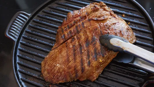 Step3Spray 12- to 13-inch round grill pan with cooking spray; heat over medium-high heat. Remove beef from marinade, and place in pan; discard any remaining marinade. Cook 10 to 20 minutes, turning once, until instant-read thermometer inserted in thickest part of steak reads 135°F (for medium). Transfer steak to cutting board; tent with foil, and let stand 5 minutes.