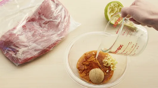 Step1Place beef in large, resealable food-storage plastic bag. In small bowl, mix taco seasoning mix, brown sugar, garlic, ground red pepper and lime juice. Pour marinade over beef. Seal bag; refrigerate, and marinate 8 to 10 hours.