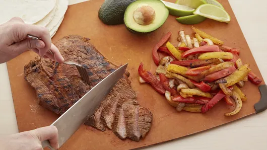 - If you want to serve up steak fajitas like you’d get at your favorite Tex-Mex restaurant, these flank steak fajitas are for you. One thing we love about this recipe is that it gets partially prepped ahead of time. The flank steak is marinated in taco seasoning mix, brown sugar, garlic, ground red pepper and lime juice for 8 to 10 hours, which makes for outstanding flavor. And once you’ve got that out of the way, this recipe is a cinch! Simply cook the steak on a grill pan, and when it’s done and resting, you’ll cook the fajita veggies in the same pan for smoky flavor. Serve with sliced avocado, cilantro, green onions, sour cream and lime for the ultimate fajita experience! Are fajitas a favorite at your house? We’ve got tons more fajita recipes where this one came from! No time to plan ahead? Try our Easy Sheet-Pan Beef Fajitas or skip the beef and go for Easy Oven-Baked Chicken Fajitas.