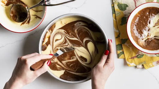 Step4Alternate spooning the vanilla and chocolate batters between the cake pans, and using a butter knife, swirl the batters together to form a marble pattern.