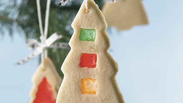 Step4In medium bowl, mix glaze ingredients until smooth and spreading consistency. Spread glaze on cookies. Decorate with candies. Thread string through holes to hang cookies.