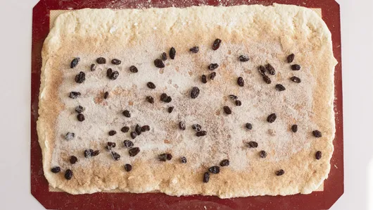 Roll dough into 15x9-inch rectangle; spread with butter. Sprinkle evenly with sugar mixture and raisins.