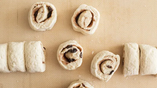 Roll up tightly, beginning at 15-inch side. Seal well by pinching edge of dough into roll. Cut into 1 1/4-inch slices; place cut sides down in pan.