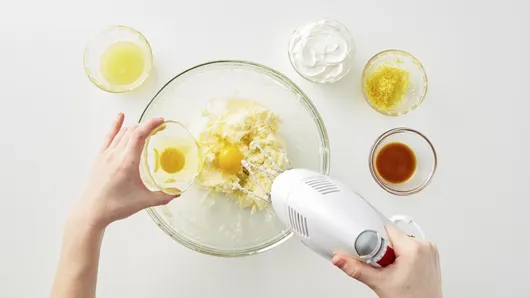 In medium bowl, beat butter and granulated sugar with electric mixer on medium speed until smooth. Beat in eggs, vanilla, sour cream, lemon peel and juice. Stir in flour, baking soda and baking powder.