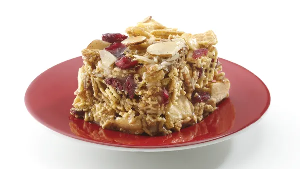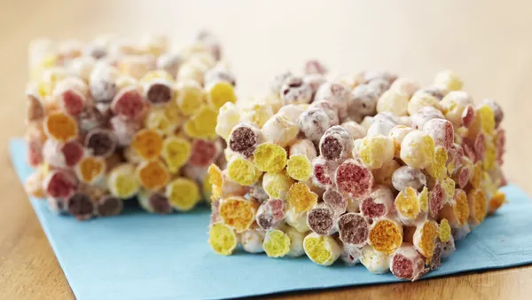 Step3Add cereal; mix well. Using waxed paper or spatula sprayed with cooking spray, press mixture evenly into baking dish. Cool 15 minutes. For bars, cut into 6 rows by 3 rows.