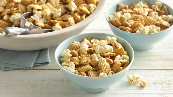 Microwave on High 3 minutes, stirring each minute. Spread on cookie sheet to cool, about 10 minutes. Break into bite-size pieces.