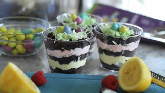 Step6In each cup, start with a layer of cookies followed by a layer of lemon cream. Repeat another layer of cookies, a layer of raspberry cream and a final layer of cookies on top. Top each cup with shredded coconut & 3 chocolate Easter egg candies.