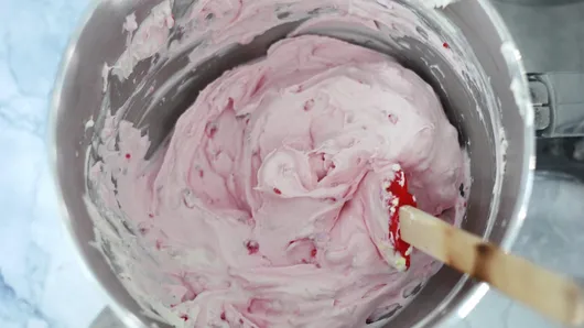 Step4Add the raspberries to the remaining cream in the mixer and mix until the raspberries are broken up. Add red food coloring to make it extra pink, if desired.