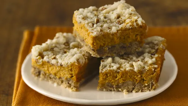 Step2In large bowl, beat eggs, granulated sugar, oil and pumpkin with whisk until smooth. Stir in flour blend, baking powder, baking soda, salt, cinnamon, ginger and cloves. Spread in pan.