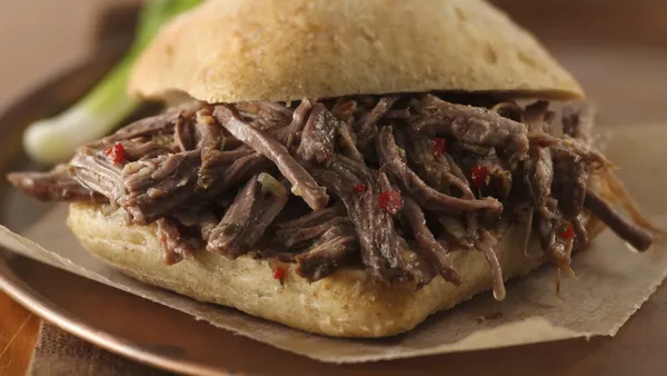 Step3Remove beef from slower cooker; skim fat from juices. Use 2 forks to pull beef into shreds; mix beef with reserved juices and remaining soup. Spoon into buns; top with cheese. Serve sliders alongside a bowl of soup.