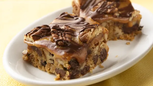 Step1Heat oven to 350°F. Make cookie mix as directed on box, using butter, vanilla and egg. Stir in 1 cup pecans. In ungreased 13x9-inch pan, press dough evenly. Bake 18 to 20 minutes or until light golden brown. Cool about 30 minutes.
