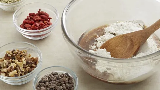 Let’s try something new for breakfast! Sprouted whole wheat flour. Goji berries. Cacao nibs. Flax seed. Start the day out this way, and anything can happen!