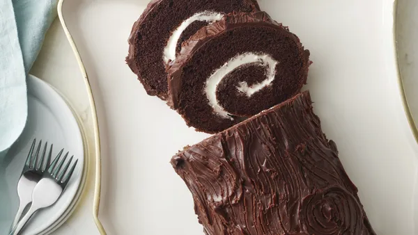 Bake 12 to 15 minutes or until toothpick inserted in center comes out clean. Meanwhile, generously sprinkle clean towel with powdered sugar. Immediately loosen cake from edges of pan; turn upside down onto sugared towel. Carefully remove foil; trim off stiff edges of cake if necessary. While hot, carefully roll cake and towel from narrow end; place on cooling rack. Cool at least 30 minutes.