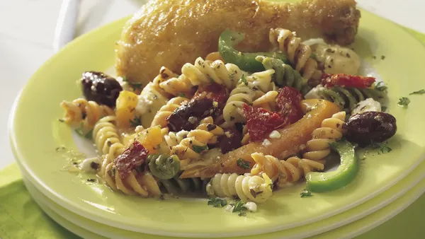 For a summer-ready pasta salad that pairs well with any grilling menu or for a quick potluck pleaser, try this 30-minute pasta. It gets a head start with Suddenly Salad and goes Greek with feta, olives and tomatoes.