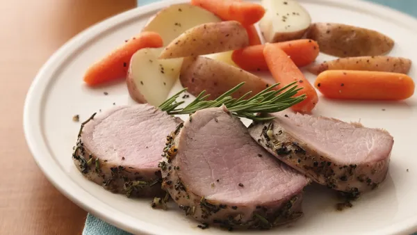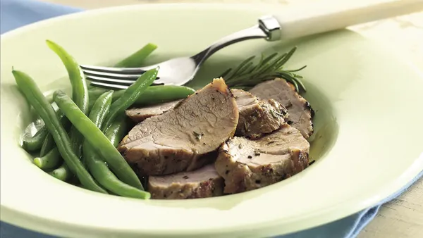 Step2Place rosemary and thyme sprigs in glass or plastic dish or resealable plastic food-storage bag. Stir in vinegar and oil. Add pork; turn to coat. Cover dish or seal bag and refrigerate, turning pork 2 or 3 times, at least 1 hour but no longer than 24 hours.