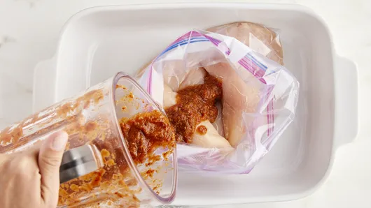 Place gallon-size resealable food-storage plastic bag in shallow dish. To plastic bag, add marinade and chicken; seal bag. Turn until chicken is evenly coated. Refrigerate at least 30 minutes but no longer than 2 hours.