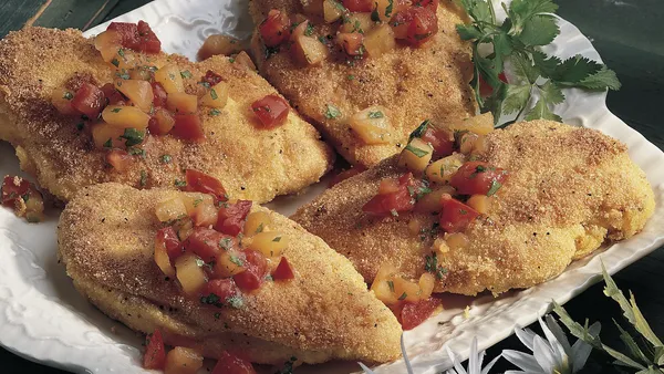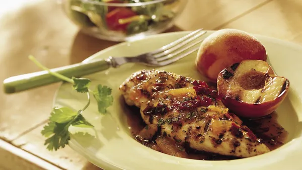 A brush of peach preserves pumps up the flavor of grilled chicken breasts. The fruit and veggie salsa is a delicious bonus.