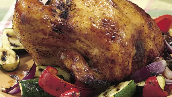 Step2Heat gas or charcoal grill. Remove chicken from marinade; reserve marinade. Place chicken on grill over medium heat. Cover grill; cook 15 to 20 minutes, turning chicken and brushing with marinade occasionally, until juice of chicken is clear when center of thickest part is cut (170°F).