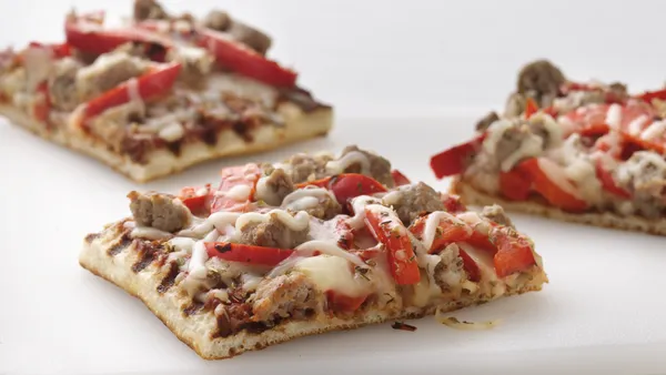 Step2Heat gas or charcoal grill. Divide dough in half. On floured surface, roll each half into 8-inch round. Place dough rounds on grill over medium heat. Cover grill; cook 1 to 2 minutes or until bottoms of crusts begin to brown.