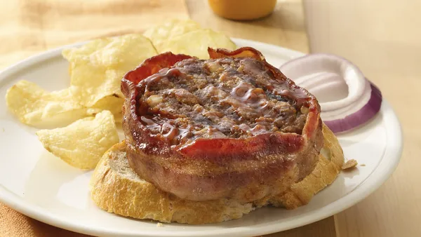 Step2Brush beef patties with steak sauce; sprinkle with half of the soup mix (dry). Place half of the onions on center of each foil piece. Sprinkle with remaining soup mix, the brown sugar and vinegar. Fold foil over onions so edges meet. Seal edges, making tight 1/2-inch fold; fold again. Allow space on sides for circulation and expansion.