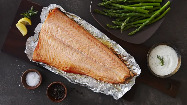 Step2Arrange zucchini and bell pepper over fish. Sprinkle with remaining basil, lemon pepper and seasoned salt. Drizzle with oil. Fold foil over fish and vegetables so edges meet. Seal edges, making tight 1/2-inch fold; fold again. Allow space on sides for circulation and expansion.