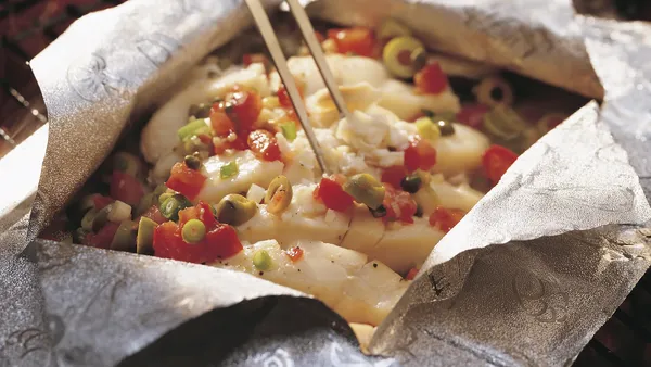Step3Cover and grill packets over medium heat 15 to 20 minutes or until fish flakes with fork and vegetables are tender. Place packets on plates. Cut large X across top of each packet; fold back foil.