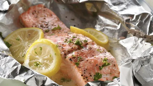 Step2Arrange zucchini and bell pepper over fish. Sprinkle with remaining basil, lemon pepper and seasoned salt. Drizzle with oil. Fold foil over fish and vegetables so edges meet. Seal edges, making tight 1/2-inch fold; fold again. Allow space on sides for circulation and expansion.