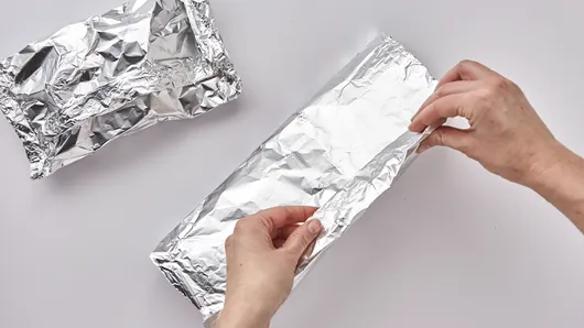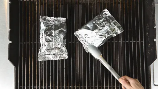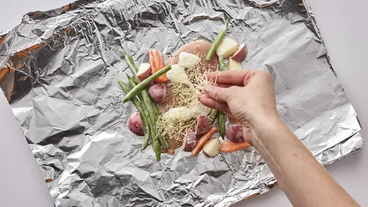 Step3Bring up 2 sides of foil so edges meet. Seal edges, making tight 1/2-inch fold; fold again, allowing space for heat circulation and expansion. Fold other sides to seal.