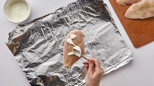 Step1Heat gas or charcoal grill. Cut 4 (18x12-inch) sheets of heavy-duty foil; spray with cooking spray. Sprinkle chicken with garlic-herb blend; place 1 breast on each sheet of foil. Drizzle 1 tablespoon of the dressing over each breast.
