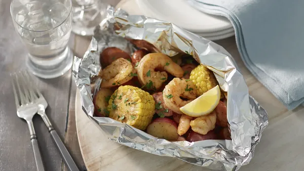 Step1Heat gas or charcoal grill. Cut two 18x12-inch sheets of heavy-duty foil; spray foil with nonstick cooking spray.