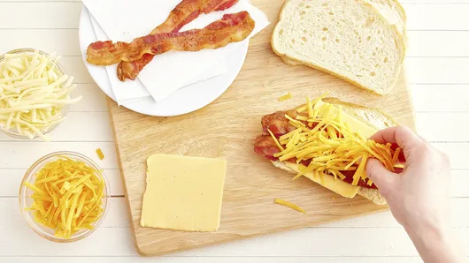 Step2On the uncoated side of 2 bread slices, place 1 slice American cheese and 2 slices bacon. Top each with 1/4 cup cheddar cheese, 1/4 cup Gruyère cheese and 1 slice remaining bread, mayonnaise side out.