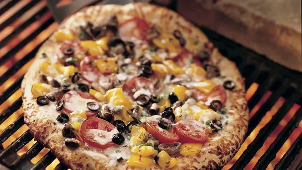 Step2Place pizzas on grill over medium heat. Cover grill; cook 5 to 10 minutes or until crusts are crisp and vegetables are hot. (If crusts brown too quickly, place a piece of foil between crusts and grill.) Sprinkle with basil.