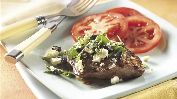 Step2Cut beef steak into 4x1/4-inch strips. In 12-inch nonstick skillet, heat oil over medium-high heat. Add beef to skillet; sprinkle with 1 1/4 teaspoons Greek seasoning. Cook, stirring frequently, until beef is brown. Drain if necessary.