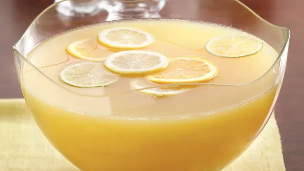 Step2Just before serving, in 3-quart or larger punch bowl, mix both carbonated beverages and thawed juice concentrate.
