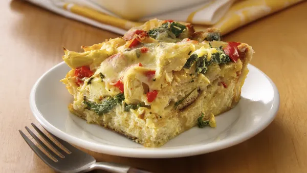 Step2In baking dish, layer ham, spinach mixture, 1 cup of the Cheddar cheese and the bread. In large bowl, beat eggs, milk, mustard and pepper with wire whisk until blended; pour over bread. Sprinkle with remaining Cheddar cheese and the Italian cheese blend. Cover with foil; refrigerate at least 4 hours but no longer than 24 hours.