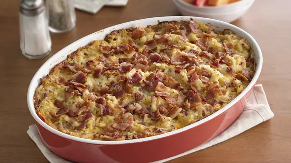 Step1Spray 13x9-inch (3-quart) glass baking dish with cooking spray. In 10-inch skillet, cook sausage and onion over medium-high heat 5 minutes, stirring occasionally. Stir in potatoes. Cook 5 to 7 minutes, stirring occasionally, until sausage is no longer pink and potatoes are lightly browned. Drain mixture on paper towels; spoon into baking dish.