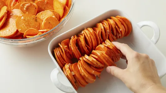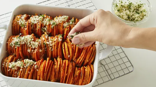 var configuration = {"title":"Hasselback Sweet Potato Casserole","introduction":"This casserole of thinly sliced sweet potatoes is more than just a pretty presentation. It practically sings with notes of sweet, tangy and herby flavor. Seasoning the potatoes with ingredients—brown sugar and apple cider vinegar—that both complement and contrast with their natural sweetness makes this a dynamic dish. The buttery toasted bread crumb topping provides a textural contrast, a touch of saltiness and lots of fresh flavor from the parsley and thyme. The end result is a perfectly balanced and deeply savory side that feels right at home at a special feast. Serve it at your holiday meal or a dinner party, but don’t hold back on making it for yourself, if the mood strikes—it’s too good to save just for special occasions.","servingSize":"1/2 Cup","image":{"small":{"media":"(min-width: 0px)","src":"https://mojo.generalmills.com/api/public/content/LN52pAYpLkWUKcEzJDH6LA_webp_base.webp?v=7fcb9899\u0026t=e724eca7b3c24a8aaa6e089ed9e611fd"},"medium":{"media":"(min-width: 500px)","src":"https://mojo.generalmills.com/api/public/content/LN52pAYpLkWUKcEzJDH6LA_webp_base.webp?v=7fcb9899\u0026t=191ddcab8d1c415fa10fa00a14351227"},"large":{"media":"(min-width: 767px)","src":"https://mojo.generalmills.com/api/public/content/LN52pAYpLkWUKcEzJDH6LA_webp_base.webp?v=7fcb9899\u0026t=191ddcab8d1c415fa10fa00a14351227"},"alt":"Hasselback Sweet Potato Casserole"},"contributor":{"label":"By","name":"Betty Crocker Kitchens","profileUrl":"/about-us","displayDate":{"label":"Updated","date":"Jul 31, 2019"}},"ingredientGroups":[{"name":"Potatoes","ingredients":[{"quantity":"3","description":"tablespoons butter, melted"},{"quantity":"3","description":"tablespoons packed brown sugar"},{"quantity":"2","description":"teaspoons apple cider vinegar"},{"quantity":"1/4","description":"cup finely chopped shallot"},{"quantity":"1 1/2","description":"teaspoons salt"},{"quantity":"1/2","description":"teaspoon pepper"},{"quantity":"3","description":"lb orange-fleshed sweet potatoes, peeled and cut crosswise into 1/8-inch slices (about 6 medium)"}]},{"name":"Topping","ingredients":[{"quantity":"1/3","description":"cup Progresso™ plain panko crispy bread crumbs"},{"quantity":"1","description":"tablespoon butter, melted"},{"quantity":"1","description":"teaspoon chopped fresh thyme leaves"},{"quantity":"1","description":"tablespoon chopped fresh Italian (flat-leaf) parsley leaves"}]}],"steps":[{"description":"Heat oven to 375°F. In large bowl, stir together 3 tablespoons melted butter, the brown sugar, vinegar, shallot, salt and pepper. Add potato slices to butter mixture; toss to thoroughly coat slices.","stepShotImageUrl":"//mojo.generalmills.com/api/public/content/tjnEY1qo40W78Y_-mMu1GQ_webp_base.webp?v=e72126e8\u0026t=51a43a57af4046789e5a7f20567b1195"},{"description":"Pick up potatoes by the handful, and place slices one on top of another, forming a small stack. Place potato stack on its side in ungreased 8-inch square (2-quart) baking dish. Continue making small stacks with remaining potatoes, and arranging them side-by-side in dish to form rows of tightly packed stacked slices. Scrape bowl for any remaining butter mixture, and spread over potatoes.","stepShotImageUrl":"//mojo.generalmills.com/api/public/content/ji-w7qImPkiPDsHZzclPMA_webp_base.webp?v=ba7f252c\u0026t=51a43a57af4046789e5a7f20567b1195"},{"description":"Bake 1 hour. In small bowl, mix bread crumbs, 1 tablespoon melted butter and the thyme. Sprinkle casserole with bread crumb mixture. Bake 12 to 17 minutes or until potatoes are fork-tender and bread crumb mixture is golden brown. Garnish with parsley. Let stand 10 minutes before serving.","stepShotImageUrl":"//mojo.generalmills.com/api/public/content/0s12qqZPtUGS8on5hSQR4g_webp_base.webp?v=0c92b926\u0026t=51a43a57af4046789e5a7f20567b1195"}],"tips":[{"title":"","description":"Kitchen Tested: 6/2019","category":"Kitchen Tested","tipShots":[]},{"title":"","description":"For the thinnest slices, use a very sharp knife or mandoline. Mandolines are kitchen tools that make it easy to thinly slice vegetables and other ingredients. A mandoline looks a bit like a cheese grater, except that it is embedded with a single blade, instead of holes. Though not an essential tool, a mandoline does make short work of the potato prep required by this recipe.","category":"Techniques","tipShots":[]},{"title":"","description":"To prep this dish ahead, peel and slice sweet potatoes. Then, submerge potatoes in a bowl of water and store in the refrigerator for up to 8 hours. When ready to use, thoroughly drain potatoes and pat dry before tossing in butter mixture.","category":"Do-Ahead","tipShots":[]},{"title":"","description":"The thinly sliced “hasselback” method of preparing potatoes isn’t just about the looks; though it does make for a beautiful presentation, taste is also enhanced. Seasonings, like melted butter and herbs, can better permeate the potato when it’s cut as such, and white, yellow and red potatoes will crisp up beautifully in the oven. Sweet potatoes are moister to begin with, so won’t crisp but will still turn out delicious. This method of preparing potatoes is said to have been invented by a Swedish chef at a hotel called the Hasselbacken in Stockholm.","category":"Techniques","tipShots":[]},{"title":"","description":"Use the biggest bowl possible for tossing the sweet potatoes in the butter mixture.","category":"Techniques","tipShots":[]},{"title":"","description":"Serve this alongside a pork roast, roasted chicken or turkey. It would make a great alternative to the classic \u003ca href=\u0022https://www.bettycrocker.com/recipes/slow-cooker-sweet-potato-casserole/2021b907-b4b5-4f3f-a9bd-f4edcdaceb26\u0022 target=\u0022_blank\u0022\u003eSweet Potato Casserole\u003c/a\u003e at Thanksgiving.","category":"Serving Suggestions/Menu","tipShots":[]},{"title":"","description":"For the prettiest presentation, look for sweet
