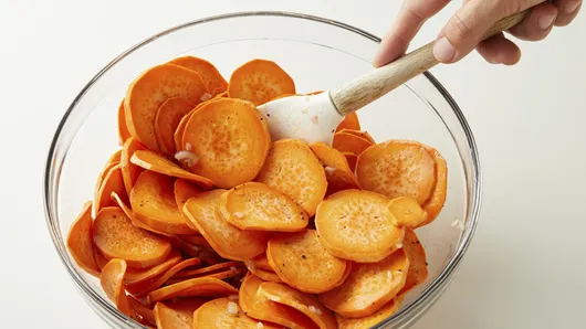 lb orange-fleshed sweet potatoes, peeled and cut crosswise into 1/8-inch slices (about 6 medium)